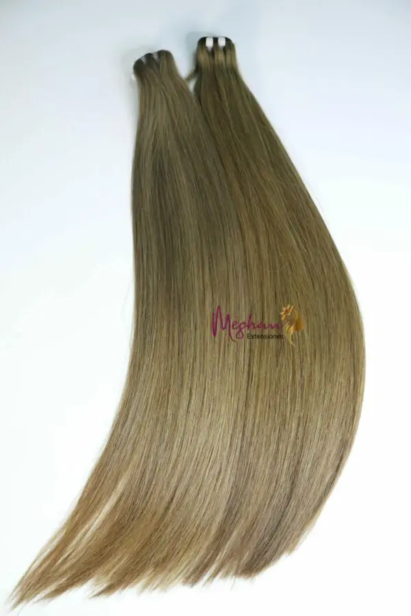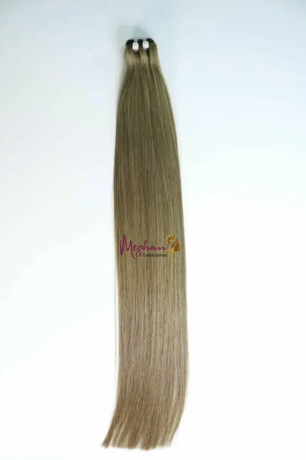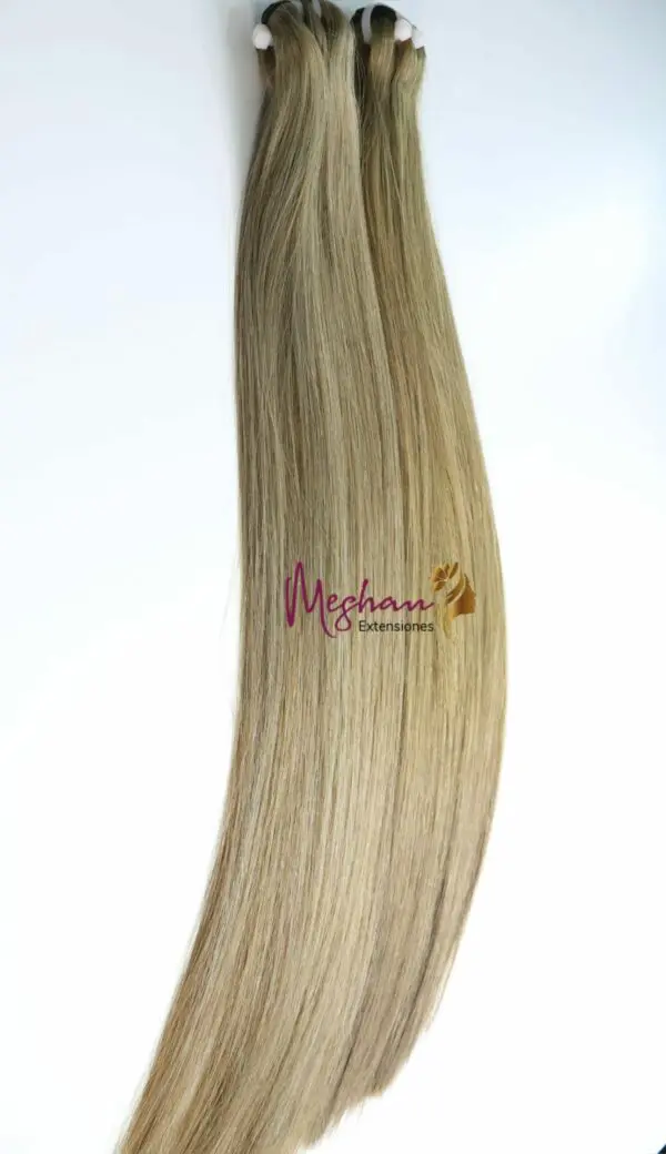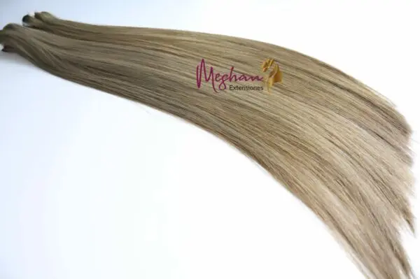 Extensiones de cabello natural liso en color rubio ceniza. Pelo 100% natural elegido de forma manual que junto con los mejores productos para dar color, obtenemos un producto de muy alta calidad. Disfruta de una espectacular melena rubia de forma cómoda gracias a estas extensiones.